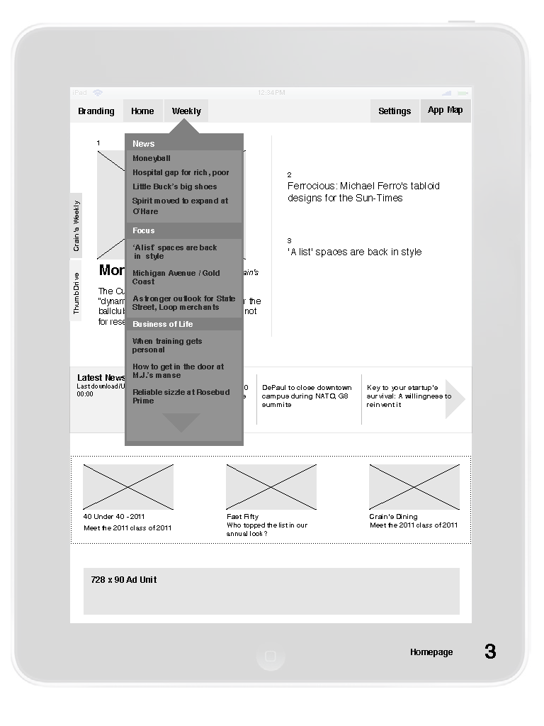 The real value of Crain’s Chicago Business is a wholistic approach to the city since many businesses are so interconnected. Instead of taking the personalized filtered view of news so many digital product have, we proposed and designed the opposite. The iPad app was curated to and focused on adjacent placement of the stories. The insight for this came in our research. People would tell us how useful Crain’s was to networking because everyone immediately had something in common having read similar stories.